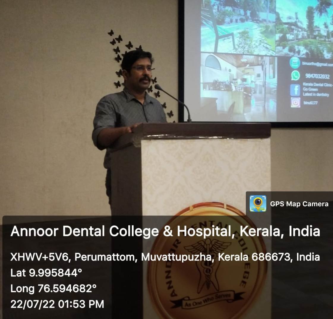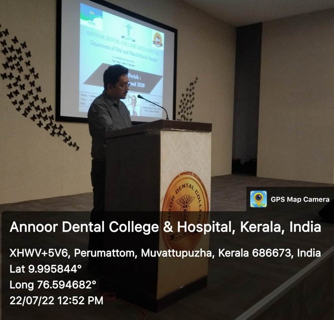 A value added program was conducted by the Dept. of Oral and Maxillofacial Surgery, Annoor Dental College & Hospital, Muvattupuzha on 22.07.2022 at 12.30 pm in the college auditorium. Dr. Binu T Abraham was the invited Guest Speaker for the day. He gave an elaborate talk on the topic “Evolve or Perish: Dentistry beyond 2030”. More than 100 students and staff participated in the program